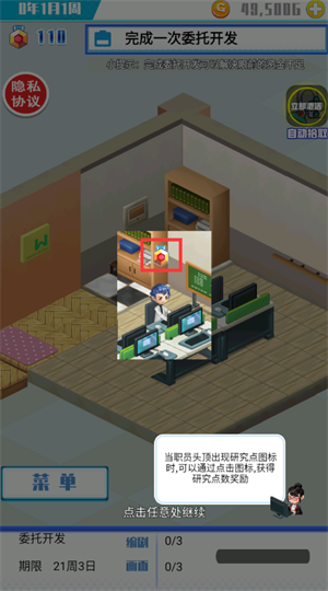 3、当职员头顶出现研究点图标时,点击该图标即可获取研究点数奖励。