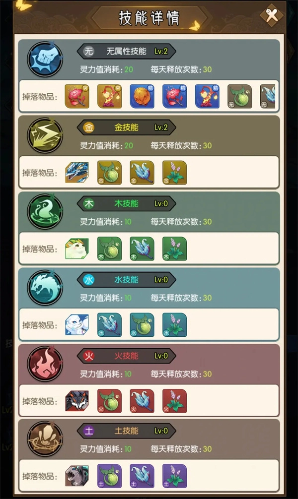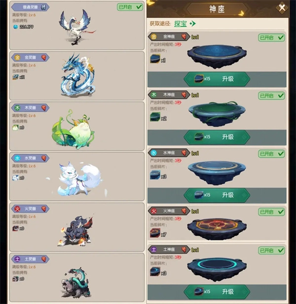 游戏中存在种类丰富的灵兽,像普通灵兽以及对应金木水火土五行属性的灵兽,这些灵兽均可以持续提升自身等级。