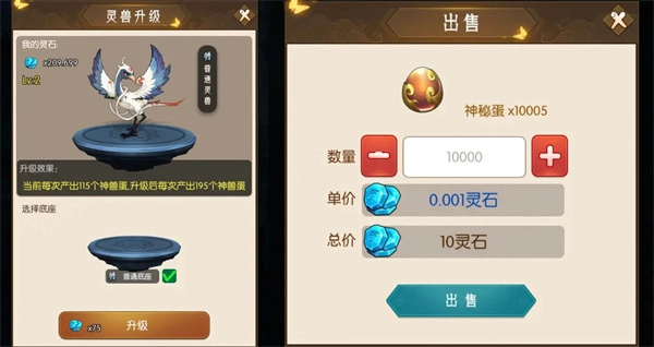 4、游戏内设有多种灵兽,其最高等级为六级,寿命仅35天,主要功能是产出大量灵兽蛋,通常1000枚灵兽蛋可兑换1颗灵石。灵兽具备饱腹值属性,当饱腹值降至零时便无法继续产蛋,需喂食“灵兽丹”来恢复饱腹值以恢复产蛋能力。
