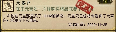 需要注意的是,务必购买高价值的物品。当把物品卖给元宝时,系统会将20%的金钱折算成25%的师门贡献,因此所卖物品的价值必须达到1400W以上才能计入业绩,这一点一定要牢记!
