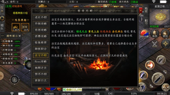 2、法宝分别四个级别,绿色凡品、黄色上品、红色仙品、金色神品,绿色、黄色、红色法宝通过法宝抽取即可获得,神品法宝需要前往盟重古镇合成。