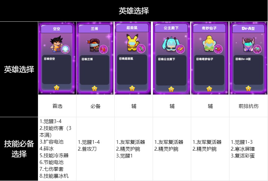 在此选择兰博,主要是看重其觉醒大招的加成效果。到了后期,要实现输出最大化,就必须搭配空空的大招。公主殿下充当配件角色(需配备友军复活器或友军冻结器),神奇博士则以前排扛伤为主要职责,其召唤觉醒并无特殊要求,但分身必须达到3 + 3的配置。