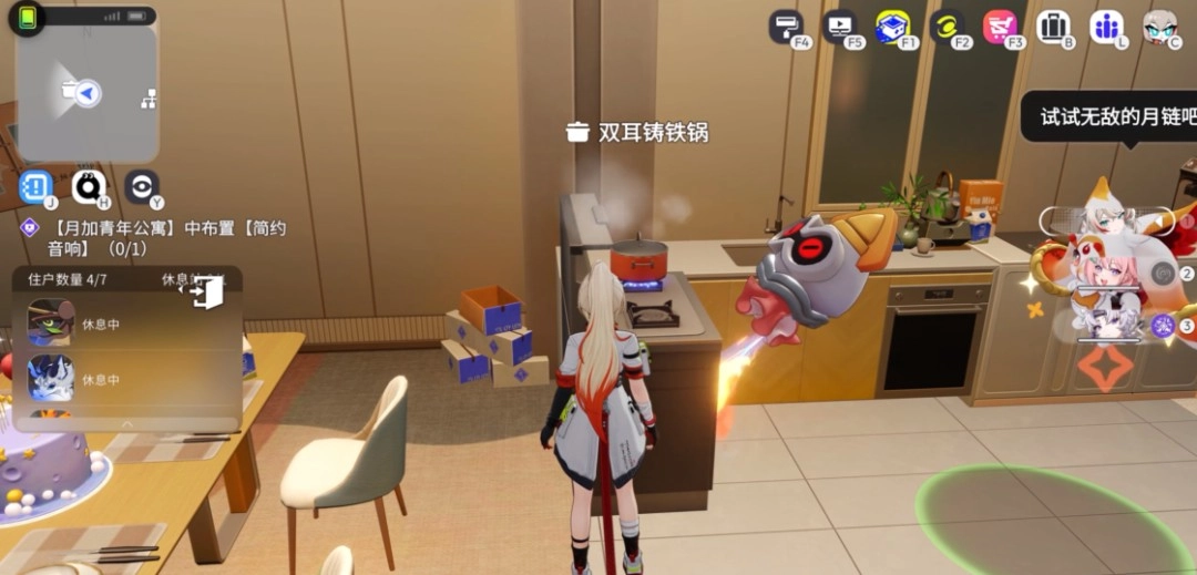 月灵的“打工”与“互动”玩法,进一步加深了玩家和这座都市的联结——开饭时,你会看到“月灵员工”从四面八方争先恐后地跑来;在自己的住处,之前提过的那只能给载具加速的喷射鱿,还能用来做饭“生火”,让整个场景充满了浓郁的生活气息。