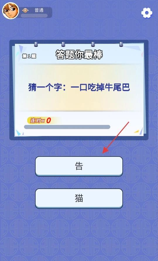 进入答题界面后,看到一道猜字题,谜面是“一口吃掉牛尾巴”,下方给出“告”和“猫”两个选项。仔细分析谜面可知,“牛”字去掉竖(即尾巴部分)后加上“口”字,组合起来就是“告”字,于是点击“告”这个选项,顺利完成了答题。