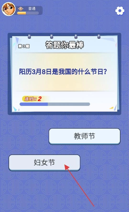 继续答题,题目是阳历3月8日是我国的什么节日,下方有教师节和妇女节两个选项,根据常识我们知道3月8日是妇女节,所以点击妇女节这个选项就能完成答题。