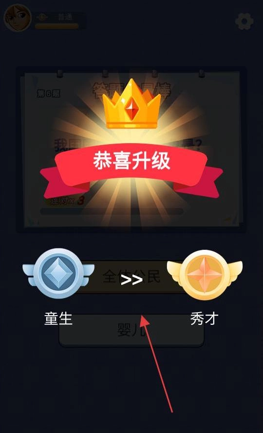 当你连续答对题目后,会弹出恭喜升级的界面,界面上会显示你的身份从童生晋升为秀才,同时有一个箭头指向升级进度条,这表明你已成功通过答题挑战并完成升级,接下来可以继续进行后续的答题环节。