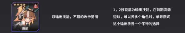 燕妮具备两个输出技能,攻击范围也相当不错,就算资源不够,也能得到良好的培养。