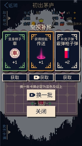 游戏里除了基础的“攻击”和“移动”操作外,每个回合还会有支援空投掉落,我们能从空投给出的三个增益效果里,免费挑选其中一个获取。