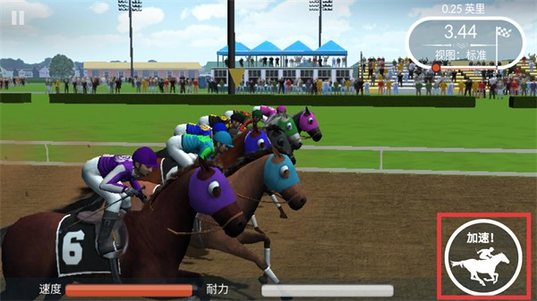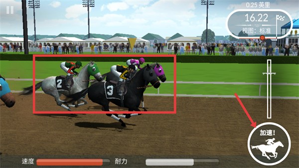 2、比赛中点击右侧【加速!】按钮提升马匹速度,同时留意【速度-耐力】条,平衡属性维持冲刺状态。