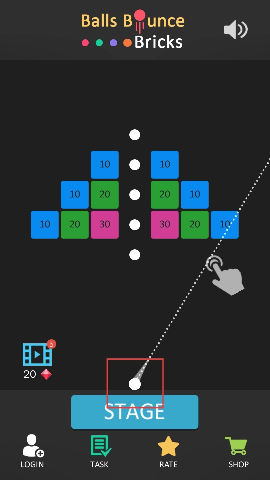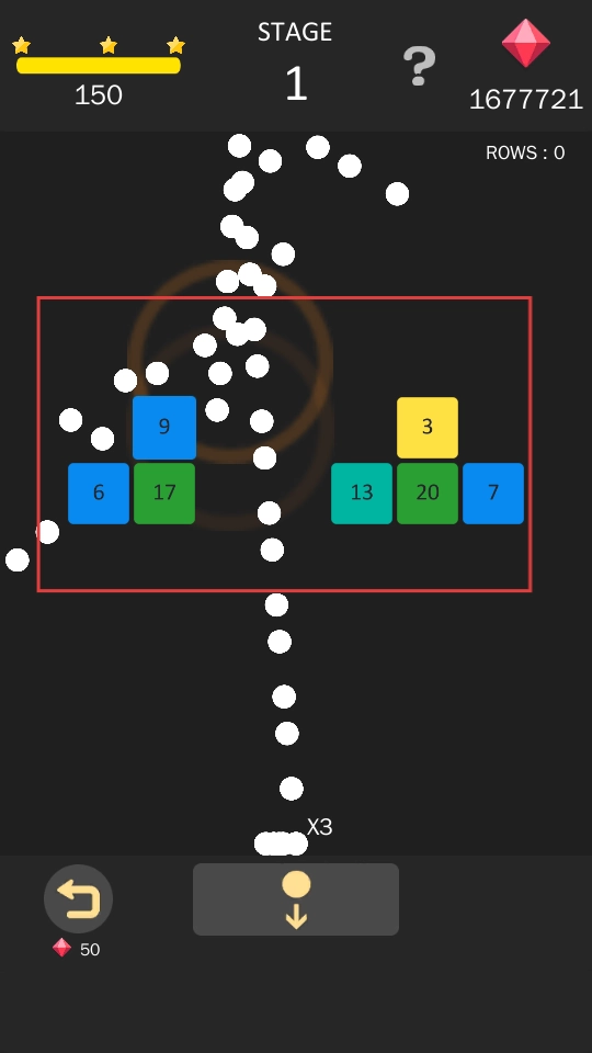 调整弹珠的发射角度后将其射出,使弹珠撞击带有数字标识的砖块。每次撞击都会降低砖块上的数字数值,当数值降至0时,该砖块即会被消除。