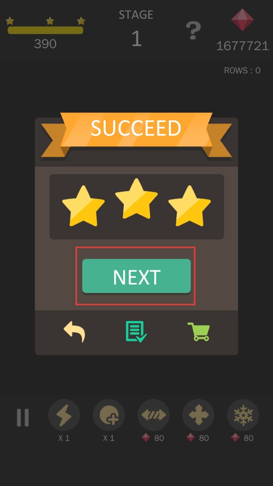 当你成功消除关卡里的所有砖块后,屏幕会显示成功界面,这时只需点击NEXT按钮,就能进入下一个关卡,继续挑战难度更高的砖块消除任务。
