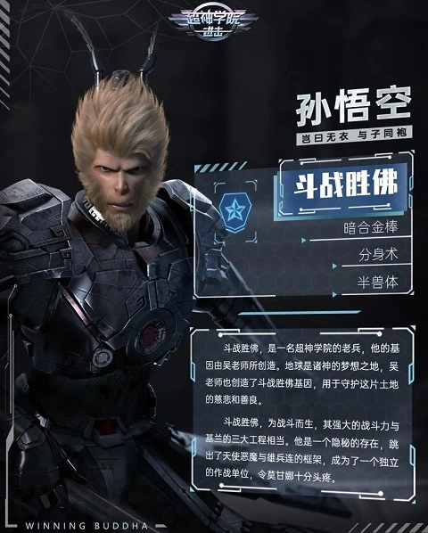 斗战胜佛是超神学院的一名老兵,其基因由吴老师创造。地球是诸神向往的梦想之地,吴老师正是为了守护这片土地上的善良与慈悲,才创造出了斗战胜佛的基因。
