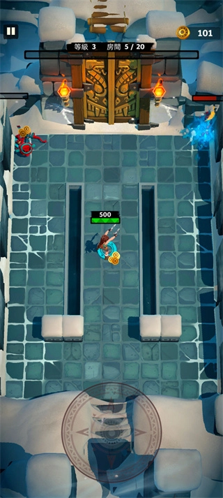 1、核心玩法为在随机生成的场景中探索、战斗与解谜,通过点击屏幕控制劳拉移动并自动攻击范围内的敌人。