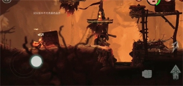 把手状的树枝打碎,木板上升,踩在上面,就可以了。蹦到第二个木板再把树枝打碎,再跳到第一个木板上,就可以翻过去了。