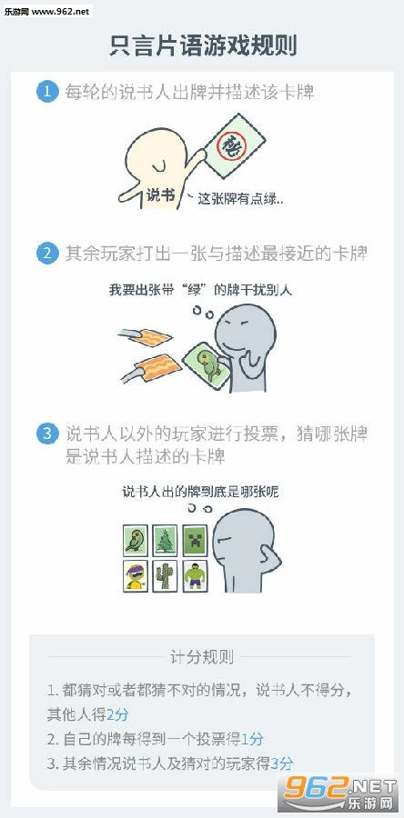 普通玩家仔细听书人描述的卡牌内容后,从自己手中挑选出最贴近描述的卡牌打出,要是其他普通玩家选中了你打出的这张牌,你就能获得分数!