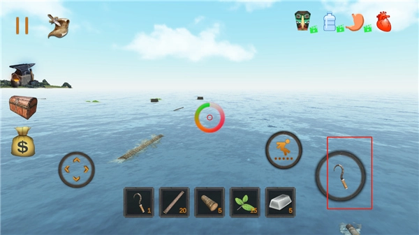 8、正式进入游戏后,玩家长按钩子即可将其发射至海洋中,红色小圆圈标示着发射位置;抛出钩子后,玩家需把握时机,点击相同图标收回绳索,以此取回勾到的木板、杂物、树叶、桶等物资,这些物资经加工后能为生存提供便利。