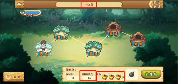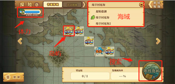1、截图左上角显示的是探险点,每次开展探险活动要消耗15点探险点,一旦探险点用完,就不能继续探险了,得等探险点恢复后才能再次进行。右上角是探险海域区域,能让各位村长快速切换不同海域去探索,每个海域所出产的材料都有所区别。在海域里进行探索需要用到航海图,借助航海图能够发现那些还没被找到的岛屿,等发现岛屿之后,就可以前往该岛屿展开探索啦~