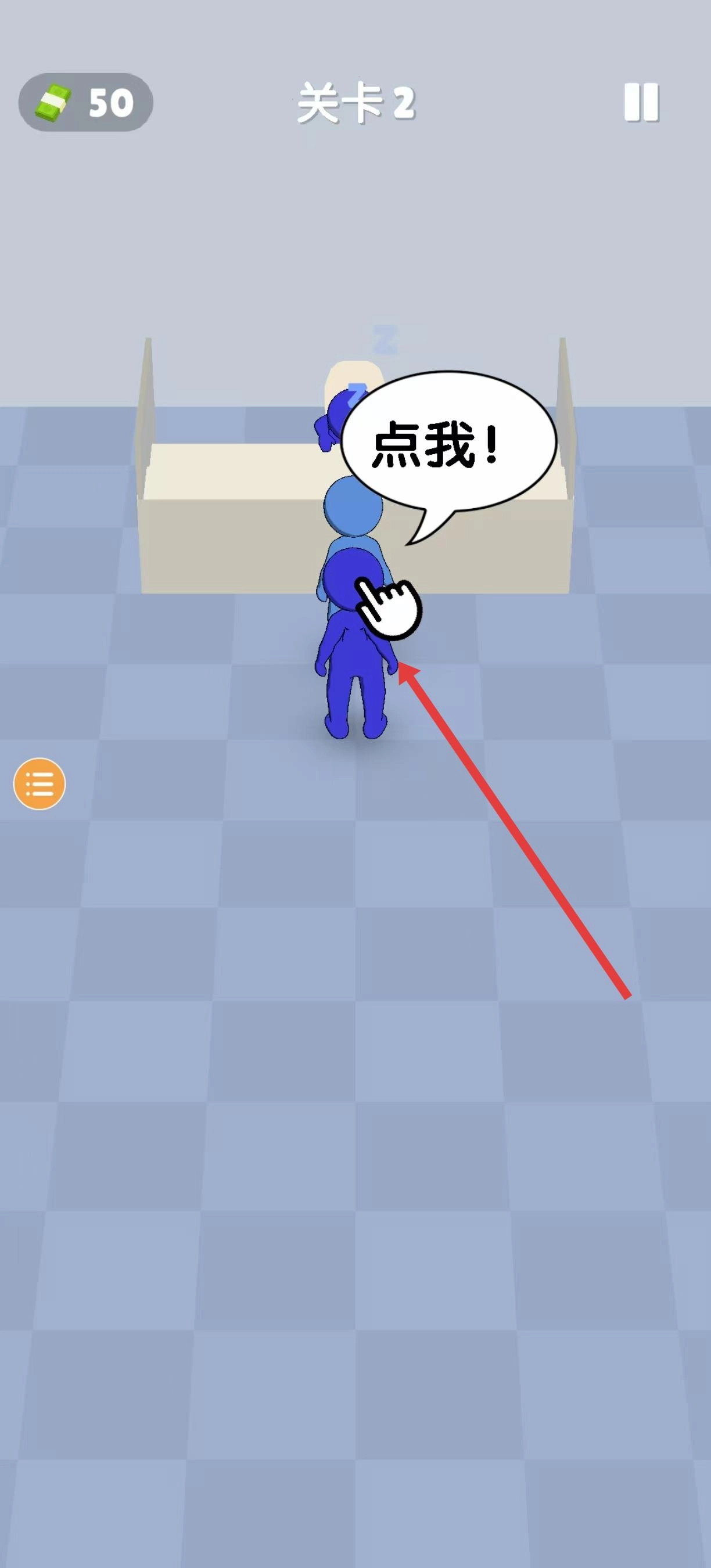 进入关卡2后,能看到三个蓝色小人整齐排列着,排在最前面的小人旁边有“点我”的提示字样。点击这个小人,它就会迅速走向工位并坐下,这样就能成功完成关卡2的占位任务了。