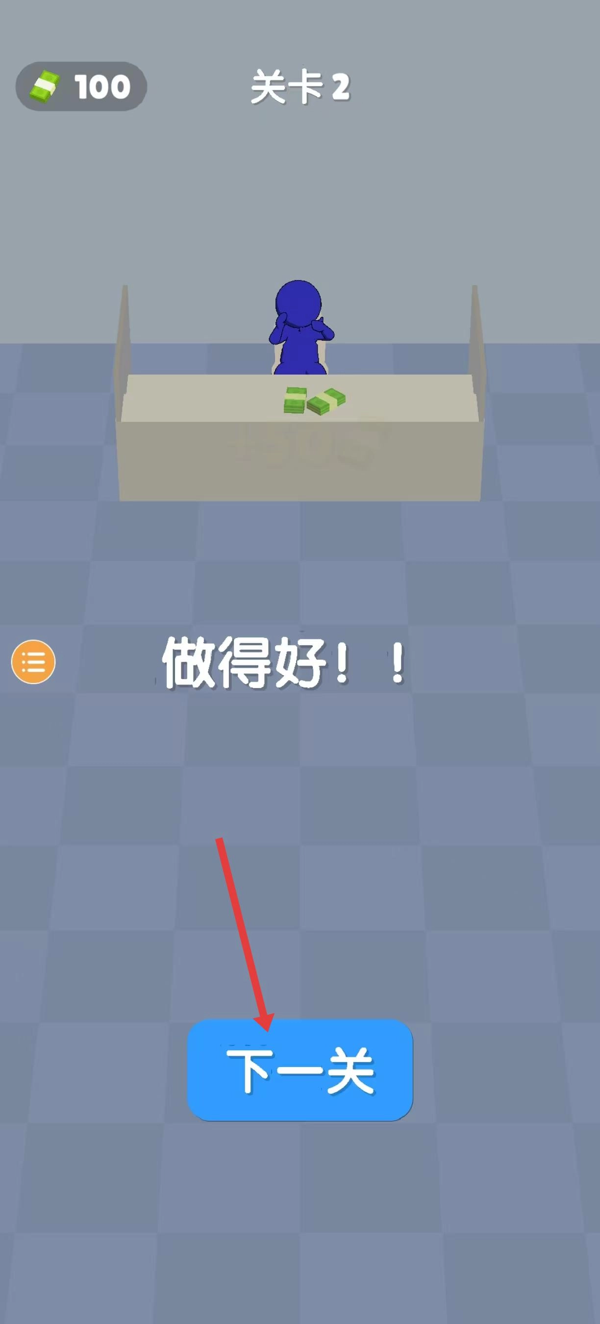 关卡2结束后,界面会显示“做得好”的提示,点击下方的蓝色“下一关”按钮,就能完成关卡2的奖励结算,货币数量随之增加,之后便会进入关卡3的准备界面。