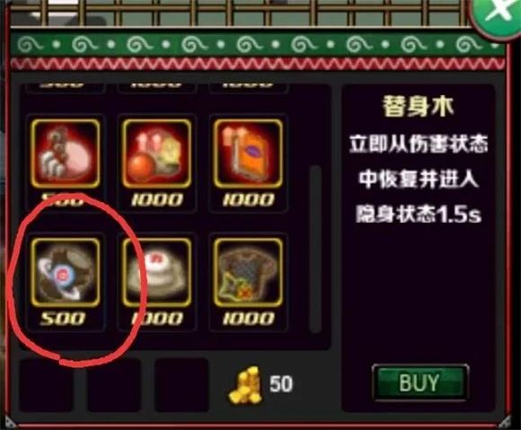 2、替身木,能让使用者瞬间从受伤状态恢复,同时进入持续1.5秒的隐身状态,售价仅500金币。