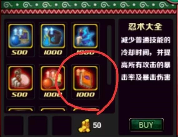 8、忍术大全,能缩短普通技能5秒的冷却时间。它在暴击方面的表现比较一般,毕竟这游戏里暴击最多也就多造成十几到二十点伤害;不过对于那些可以多次触发伤害的技能来说,它的效果就很显著了——比如黑炎这类总伤害约8000但单次仅80点伤害的技能,搭配忍术大全后相当于提升了20%的输出效率。