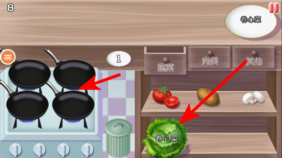 3、当需求为卷心菜时,切换到蔬菜分类,选中卷心菜并放入空的煎锅中烹饪。