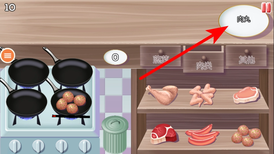 2、进入关卡后,查看上方的菜品需求如肉丸,从食材区的对应分类中选择食材。