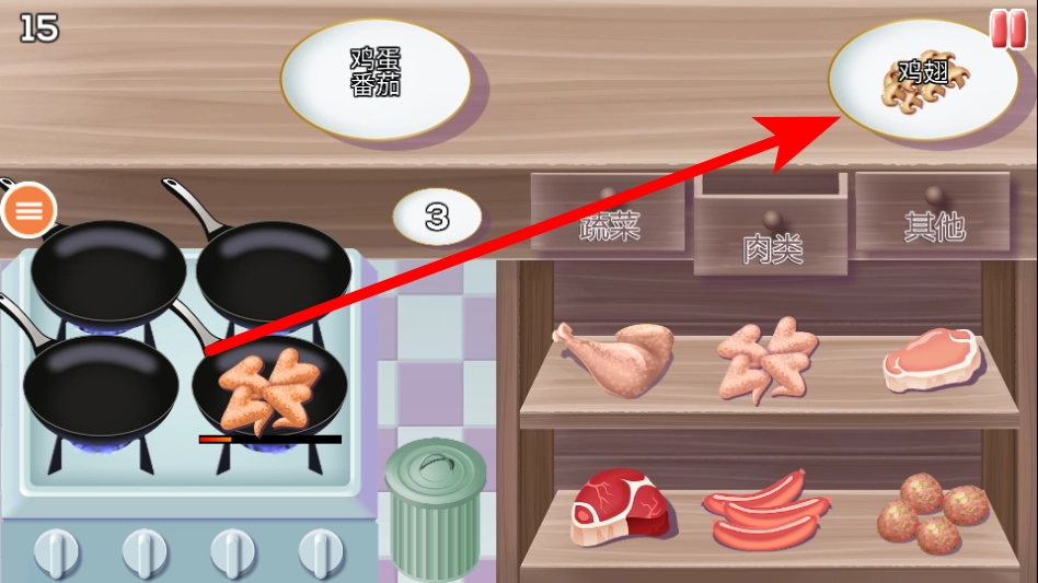 4、后续根据新的菜品需求如鸡翅,从对应分类里选食材,放入煎锅完成烹饪任务。