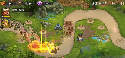 第二波:后方火炮升到三级。来了几只兽人勇士和地精医生,民兵全面崩溃,大量的怪物冲到第二部队。在怪物大量聚集的敌方使用火雨技能清场。