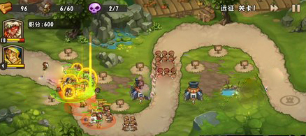 第一波:开局英雄移动到第一部队处,在第三部队处配置炮塔。这一波全是最弱的苦工,地精医生没几只,一群民兵就能守住,没什么难度。
