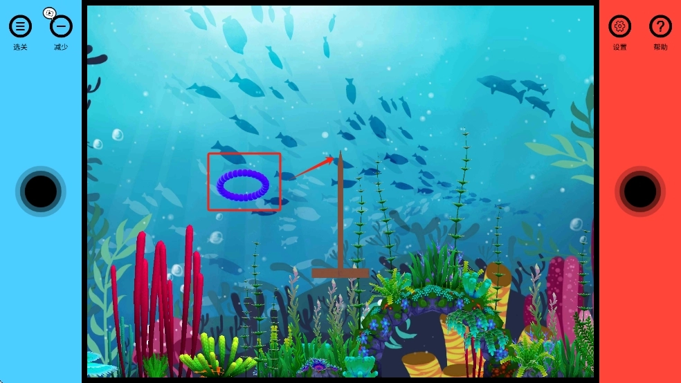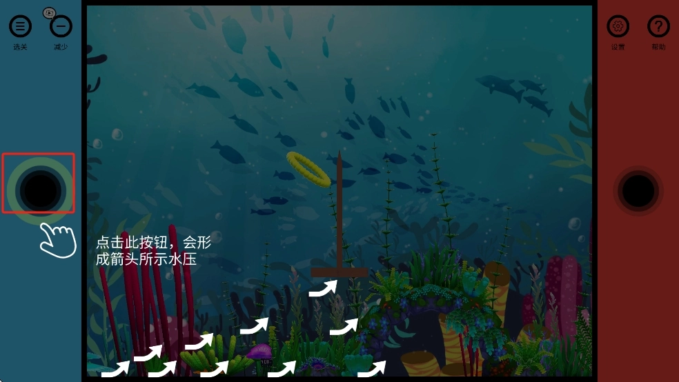 游戏开始时,我们点击左边的黑色按钮,这样就能触发箭头指示的水压,水压会推动黄色圆环顺着水流方向朝中间的杆子移动。