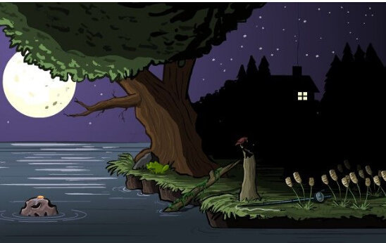点击树洞,鸟儿就会来吃虫子;湖边有鱼竿,点击鱼竿后,虫子会爬上去,最后弹走。
