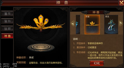 道士学会召唤神兽技能后,点击主界面的角色按钮,界面上就会显示出神兽的页签按钮。