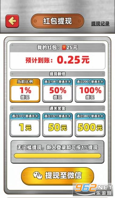 你通过的关卡数量越多,提现时能拿到的比例就越高。另外还有提示说,只要完成26个关卡,就能提现200元。