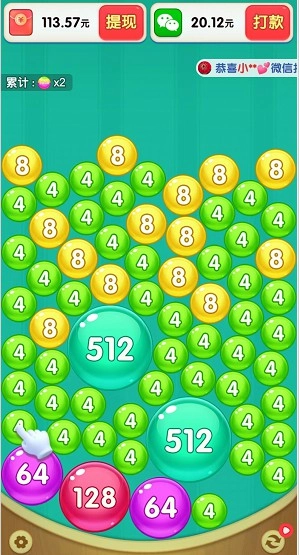 2、玩家需要不断控制数字小球移动,将相同数字的小球合成在一起,形成更大的数字。每成功合成一次,不仅数字会变大,还有机会获得红包奖励。
