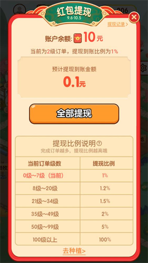 是可以提现的,玩家完成订单就可以获得红包,收获作物、成就奖励、看广告视频也可以获得红包,游戏中的红包提现是按百分比进行提现的,初始比例为1%,订单级数越高提现比例越高,最高100%。