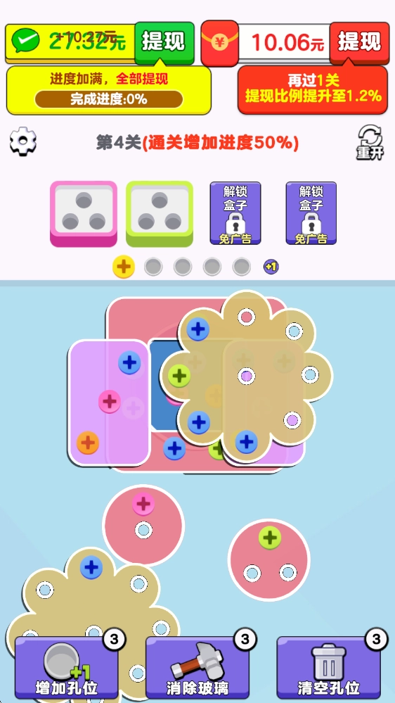 成功在螺丝盒中装入三颗螺丝即可消除,随后会随机生成新的螺丝盒。