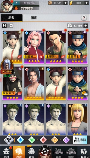 2、第二套阵容:药师兜+君麻吕+宇智波带土+鬼灯水月+香燐。