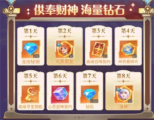 3、新人每日签到都能获取不少实用福利,像钻石、高级召唤契约、神龙鼎碎片之类,每一样都很有用处。