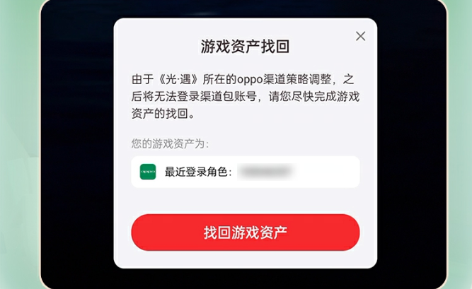 2、登录待资产找回的OPPO渠道服账号,确认登录角色是否为资产找回角色,点击【找回游戏资产】按钮