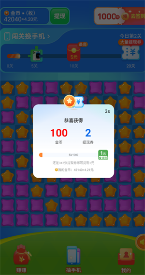 3、玩家达成第五关即可参与抽手机活动,日常关卡通关后便能获取抽奖券