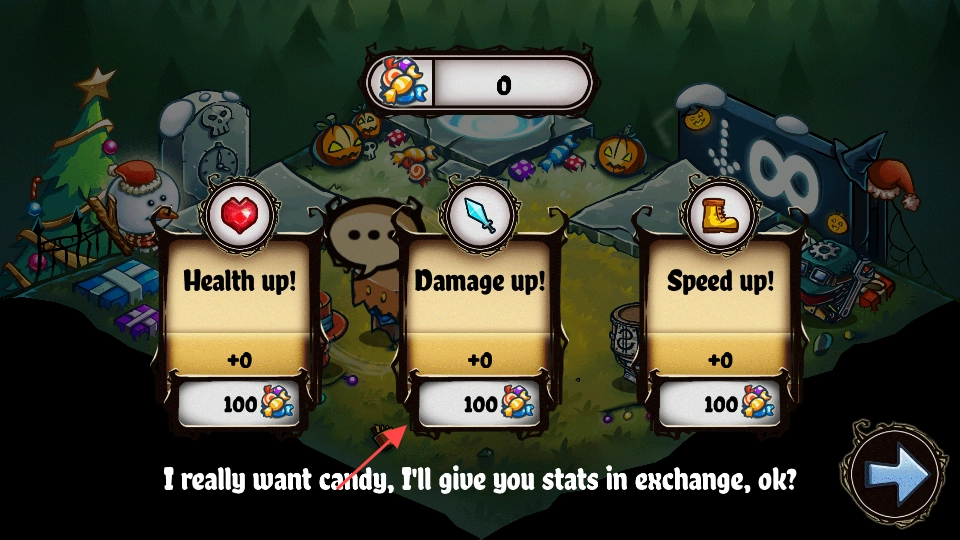 3、遭遇属性强化选项时,可按需选择【Damageup!】等提升条目,消耗对应数量的糖果完成能力强化。