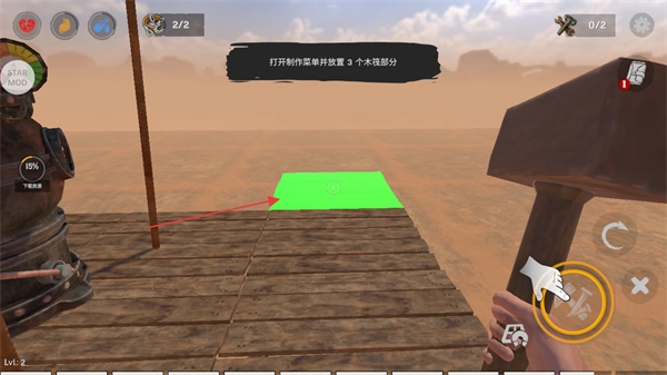 4、按提示打开制作菜单,放置3个木筏部分,推进木筏搭建进程。