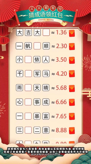 这是一款0.3元红包成语答题小游戏,玩家在游戏里能通过答题、完成任务、观看广告等途径获取红包,红包提现是按照百分比来计算的。