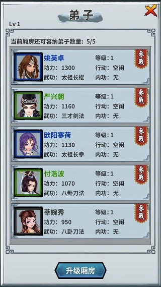 由于升级武功的经验无法返还,建议开局就优先升级山门,刷取A级及以上品质的人物,若能刷到S级则更佳。否则一旦更换人物,武功等级就需要重新培养。