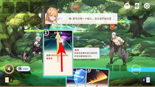 4、在战斗中,选择箭头指引的技能卡片,可触发技能效果提升战斗效率,这是优化战斗策略的操作。