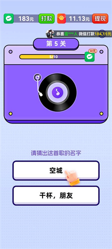 猜歌我最棒是由天津清源互动科技有限公司运营的一款猜歌赚钱游戏。玩家每猜对一首歌曲就能获得可观的红包奖励,通过关卡后即可申请提现,红包到账速度极快,通常几秒内就能到账。游戏中的歌曲大多是常见曲目,难度设置较为适中,玩家可以尽情享受挑战的乐趣。