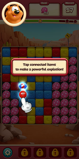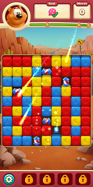 2、延续经典三消玩法,通过点击交换方块完成消除任务。