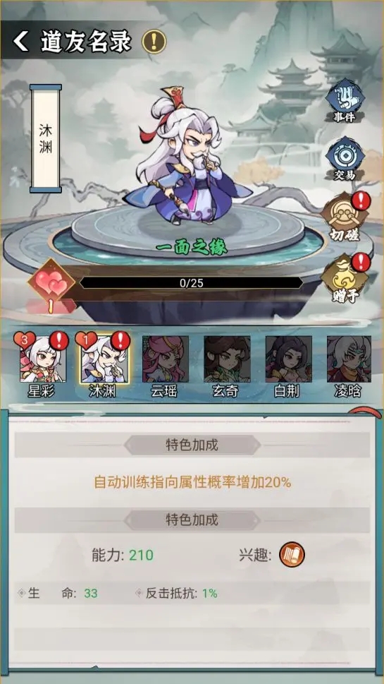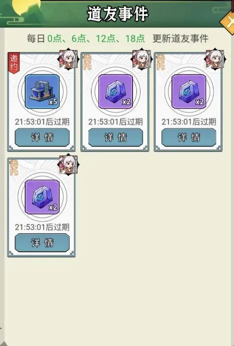 每天的0点、6点、12点和18点会进行刷新,道友相关的事件主要有邀约、委托和交易三种类型。其中,邀约事件需要根据要求派遣对应的道友去处理,等倒计时结束后就能领取相应奖励;委托事件则需要提交指定的道具,提交完成后会启动倒计时,倒计时结束后可以手动领取奖励;交易事件会推出一些打折商品供玩家购买。需要注意的是,道友事件出现后会停留24小时,之后便会消失。