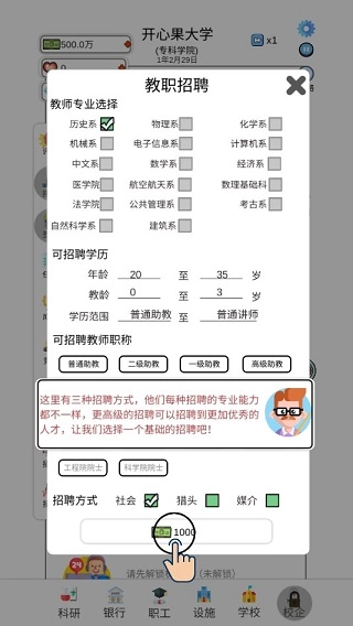 一所刚刚成立的学校,首先要组建自己的教师队伍,根据图中提示,点击“招聘”来搭建属于自己的教师团队。